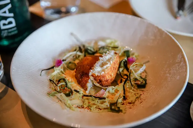 ▲熱前菜-香脆蟹餅、黃卷、柚子胡椒蛋黃醬、秋葵 $480