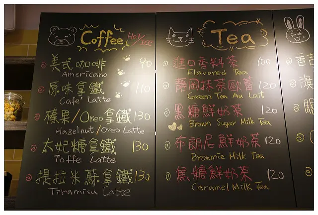 櫃檯上方的手寫黑板MENU好可愛~還有小貓和兔子陪你點餐