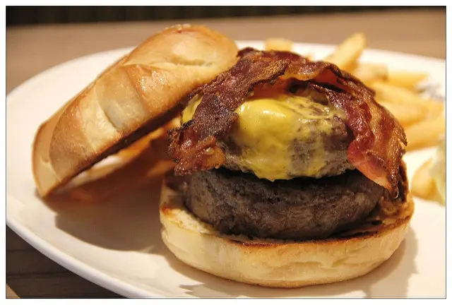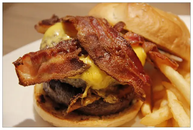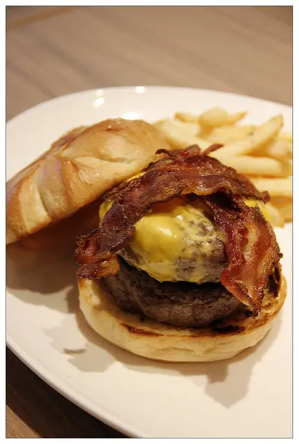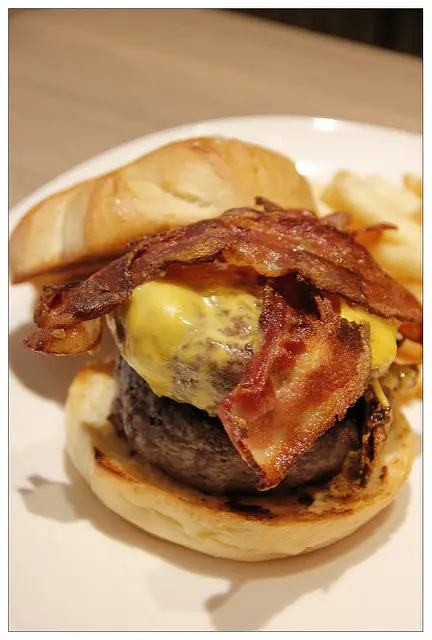 最上層的漢堡肉還淋上了香濃的起司再放上了煎到酥香的培根