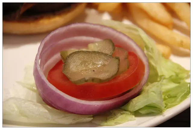 一旁有生菜、番茄、酸黃瓜以及紫洋蔥可以讓客人自行搭配漢堡的吃法