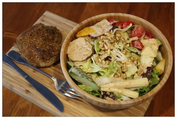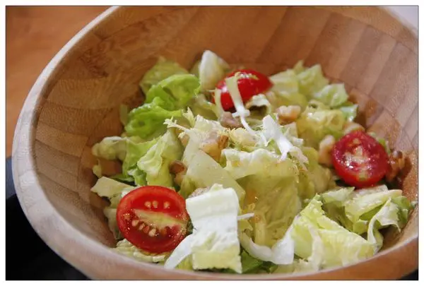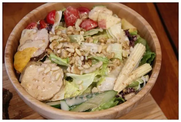 裝成在木碗裡的小沙拉搭配的是油醋醬汁~