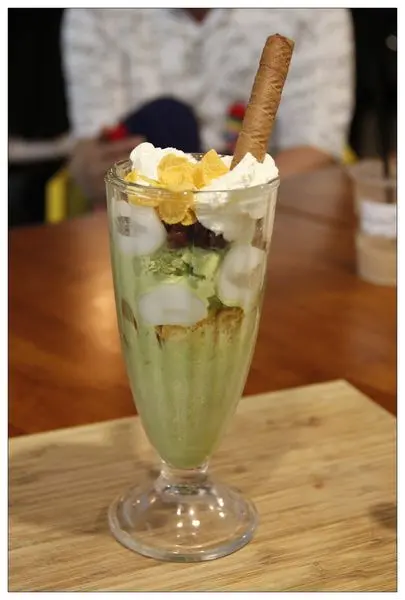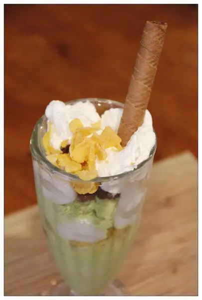 抹茶冰淇淋、日式麻糬、日式蜜紅豆、玉米脆片、鮮奶油