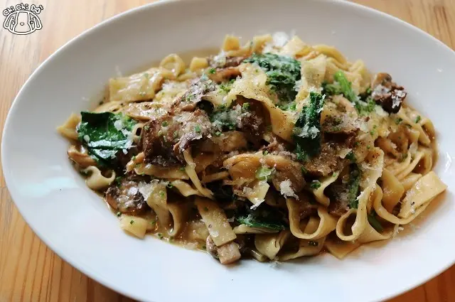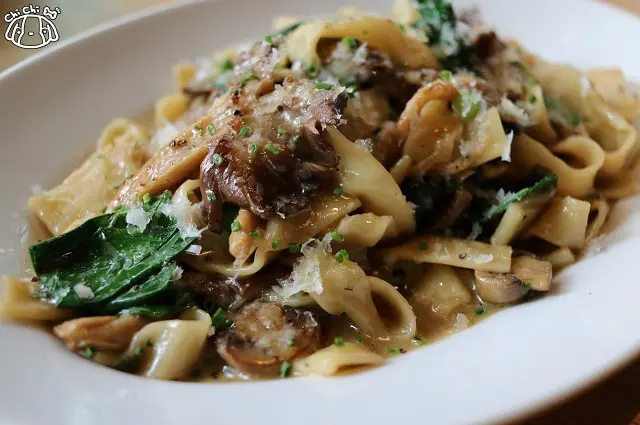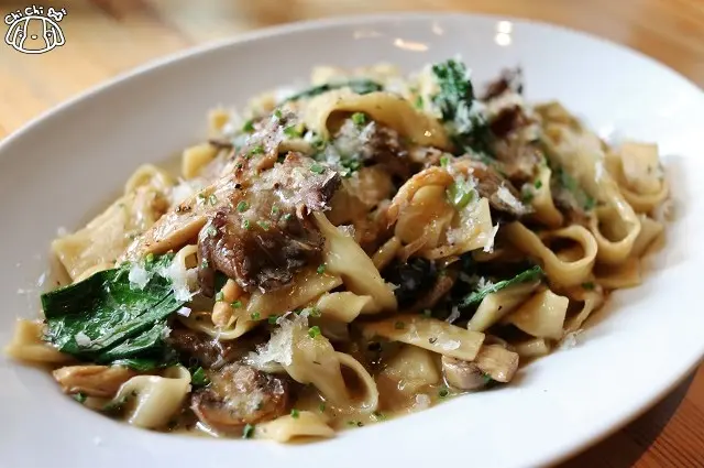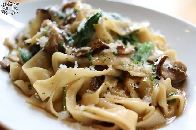 整個菌菇的香氣濃郁且新鮮多汁,用的是寬麵條,