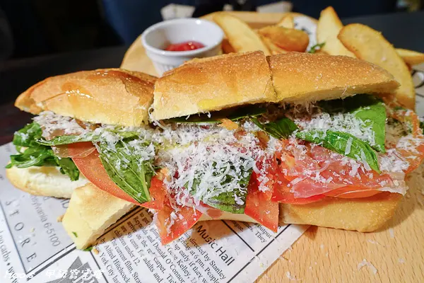 一大條外酥內軟的軟法,夾滿番茄片、生火腿、青綠羅勒葉,