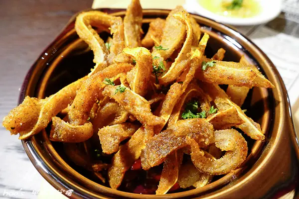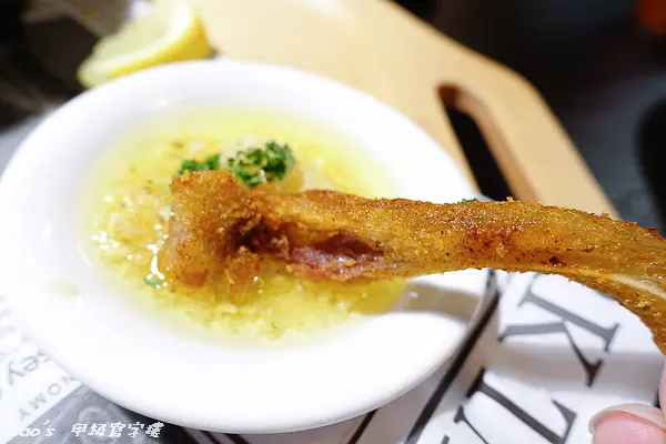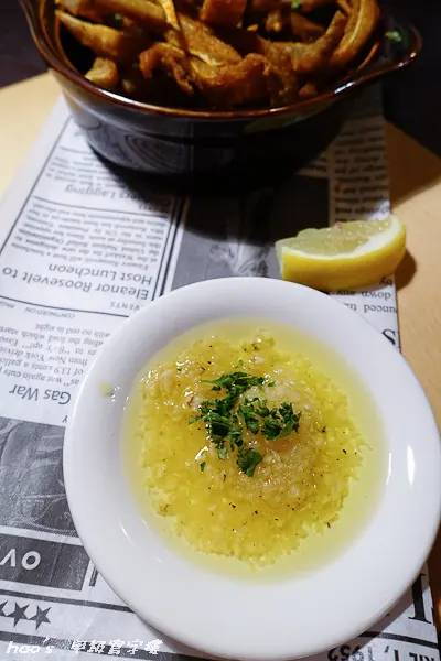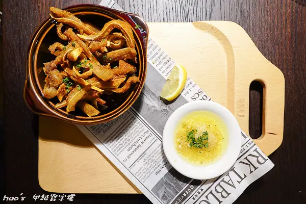 滿滿的豬耳朵,炸至金黃酥脆,搭配檸檬及香蒜橄欖油。