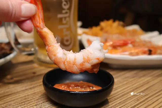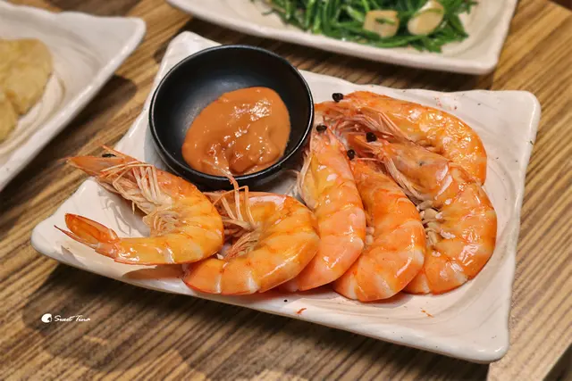 海神殿 - 新鮮現燙的蝦子超鮮甜,單吃就很美味,一旁附的醬料口感相當獨特,帶點芥末的香氣,搭配後風味更棒。