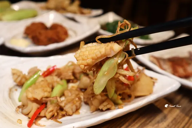 辣炒花枝 - 搭配芹菜和薑的炒花枝,微辣清爽,499的菜單就能吃到,絕對要來一盤。