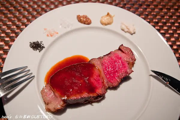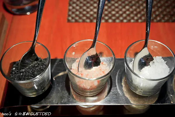 醬料共有七種,首先是主廚特調的波本威士忌酒濃縮牛肉汁。三種鹽類-黑鹽、玫瑰鹽、海鹽。