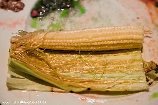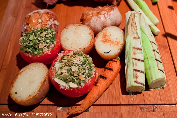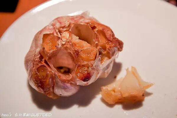 配菜部份有2大顆完整的烤大蒜、2顆義式香料核果烤番茄、2份帶殼玉米筍、