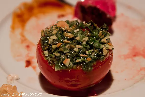 香料烤番茄的番茄去蒂,外層保持完層,內裡塞填滿滿的核果麵包屑青醬香料再烘烤,