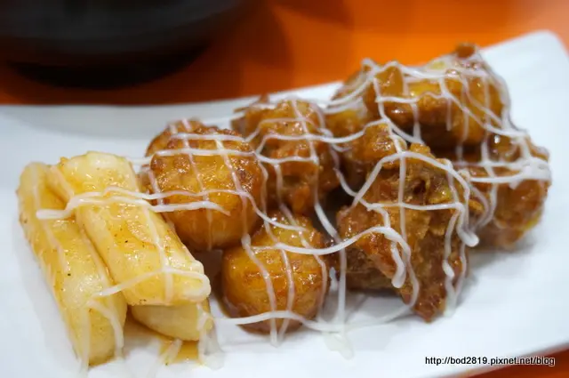 一份有三種東西:年糕、薯餅跟炸雞,