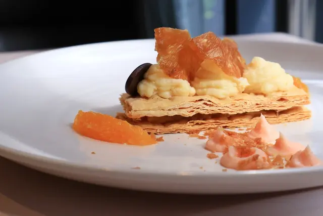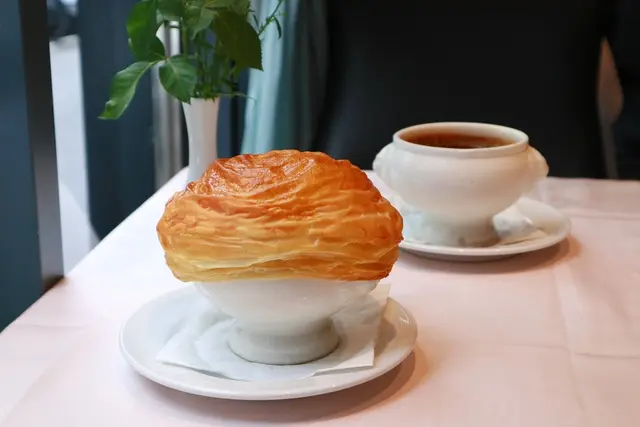 為了能讓顧客享用熱呼呼的美食,上桌後服務員會將酥皮放在另一個盤子上。