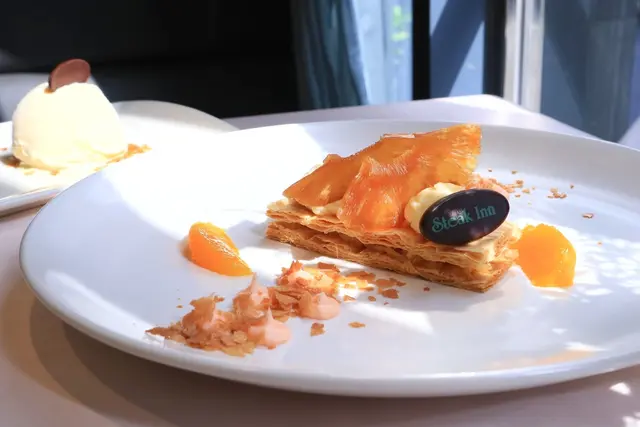 每季甜點不一定,今日是夏日鳳梨派,一送上來剛好窗外的日光灑落,光線打在白盤上整個就超夢幻,