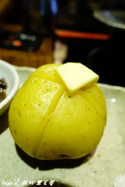 原顆上桌,飽滿圓潤,從中切為四份,蒸熟後以奶油切片添香,可充份品嚐馬鈴薯的自然原味,