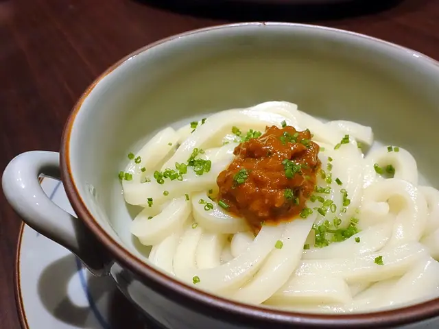灑上青蔥的烏龍麵搭配辣味噌食用