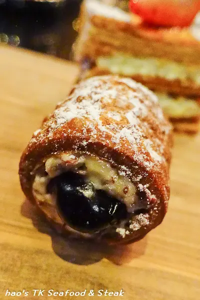 以麵皮捲著起司及巧克力酒,經油炸灑上糖粉,
