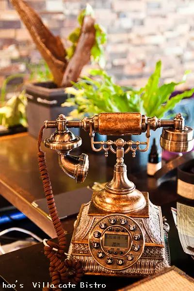 吧檯上放置著金銅色古董手持話筒造型的多功能電話,老公說真的可以接聽撥打,金光閃閃看來好貴氣~