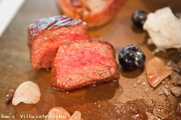 板面灑著玫瑰色的岩鹽,但顆粒太大,用牛肉沾著吃也不方便,可能是為了視覺效果灑上的吧。