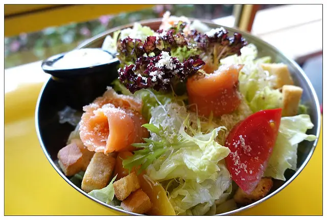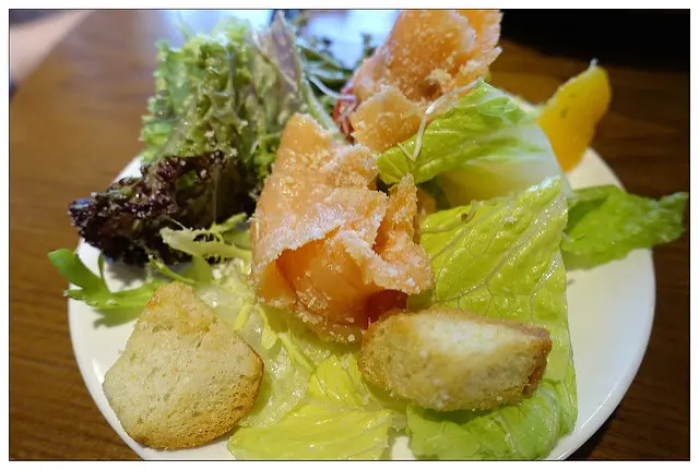 份量還不少的沙拉除了有麵包丁、切片番茄以及新鮮生菜之外
