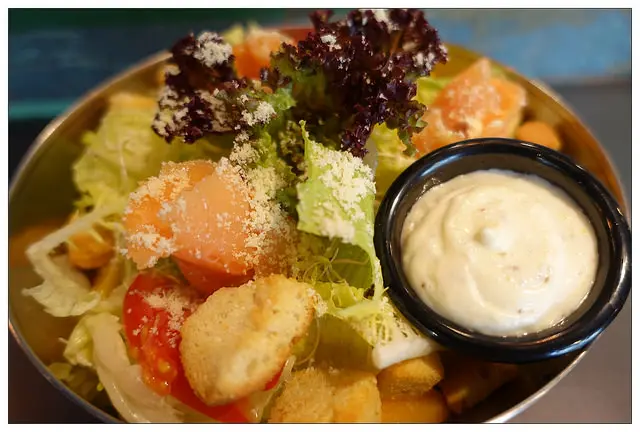 豪邁的撒上起司粉之後再淋上酸甜的凱薩醬~吃起來相當夠味