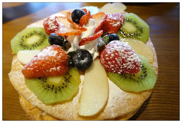 酥脆的披薩餅皮上方舖滿了奇異果、草莓、蘋果和藍莓