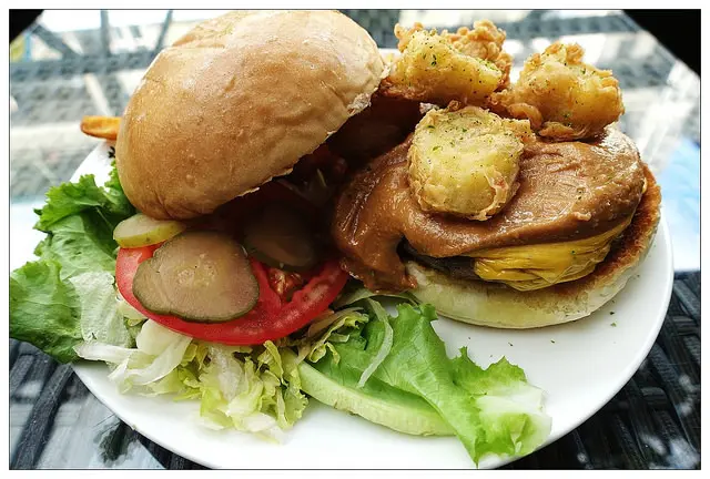 漢堡旁有新鮮美生菜以及番茄、酸黃瓜等可以夾在漢堡裡一起享用