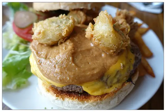 底下的手工牛肉漢堡厚實可口~和綿密香濃的花生醬中間還有香氣十足的巧達起司