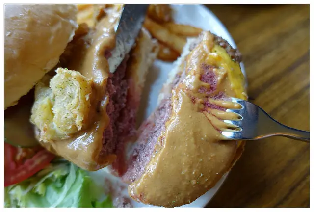 刀子一切下肉汁就汩汩流出~這漢堡真的是邪惡的化身無誤