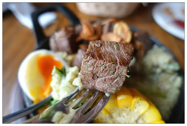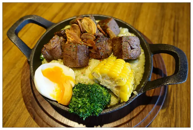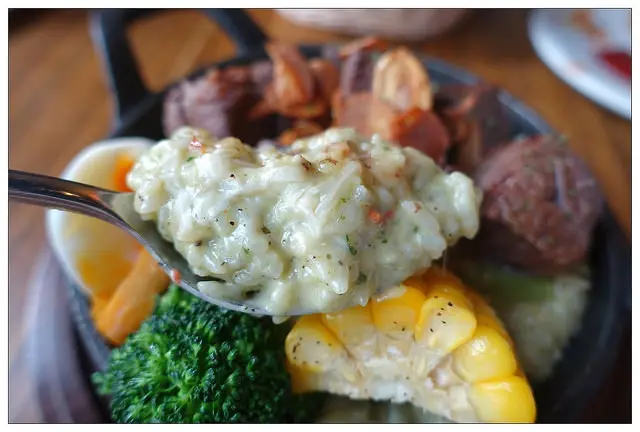 一旁的配菜則是有鮮甜的玉米、花椰菜以及誘人的半熟蛋