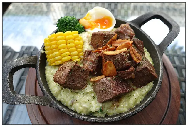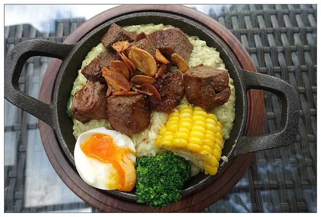 用鐵鍋裝盛的燉飯上豪氣地舖上多塊菲力骰子牛~