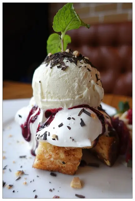 層層疊疊的蜜糖吐司上方是綿密的鮮奶油以及香草冰淇淋~撒上巧克力碎片做妝點