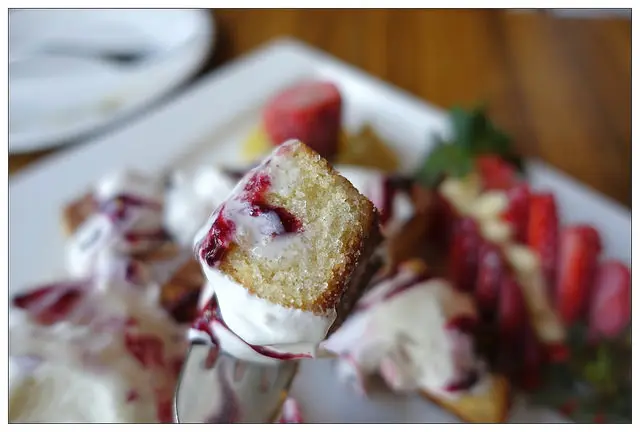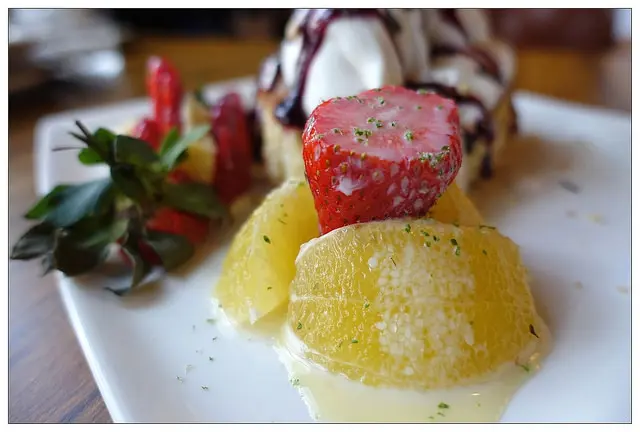 一旁則是有新鮮草莓及柳丁切片再搭配甜滋滋的卡士達醬
