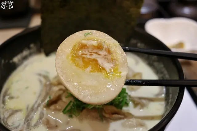 配料有豬五花肉片和自製的糖心蛋,五花肉片不錯吃,