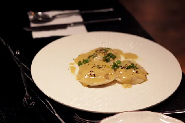 ▲第一道主食-甜蝦松露餃與鴨肝天鵝絨醬汁