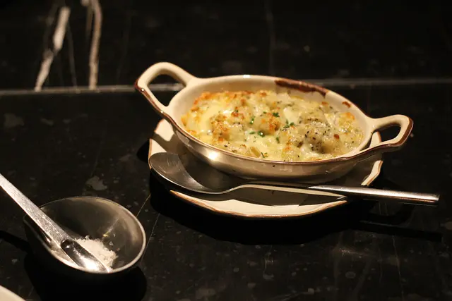 (牛排搭配的焗烤松露通心麵)
