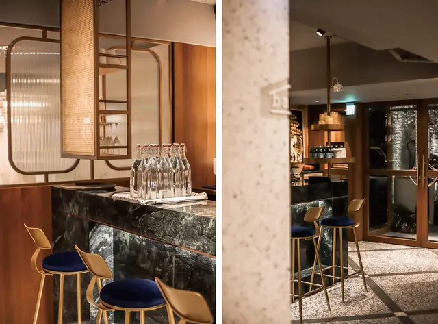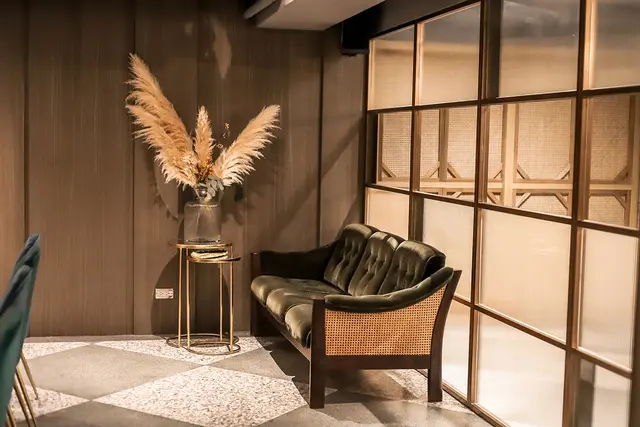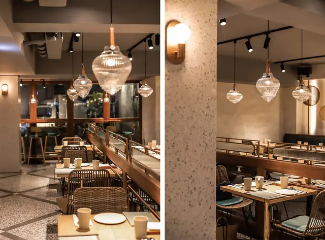 我很喜歡洗石子壁面加上玻璃的隔間裝置以及燈飾,藤編座椅及竹編篩子也帶出了南洋風情,同時讓人感覺很摩登