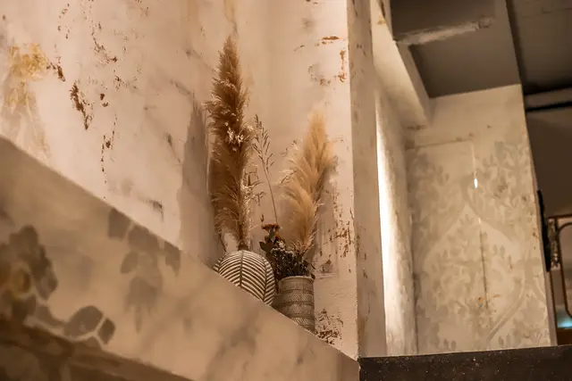 牆面的佛像及大象圖案是保麗龍雕刻拓印,襯著有點斑駁的牆面還滿美的