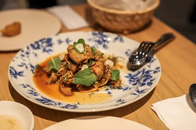 以羅旺子、椰糖為基底的醬汁,搭配紅蔥頭、美國香菜等辛香料等一起拌炒後風味更多層次,松阪豬則是薄脆的口感