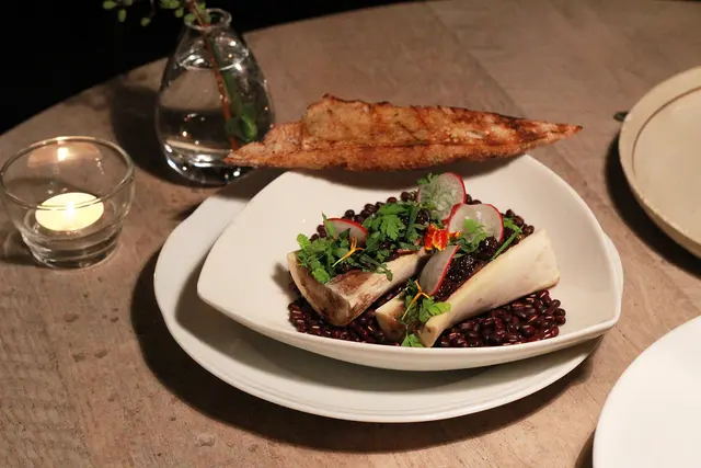 牛骨髓上方佐了培根醬及綜合香草,吃的時候要連同骨髓一起挖起配著麵包吃