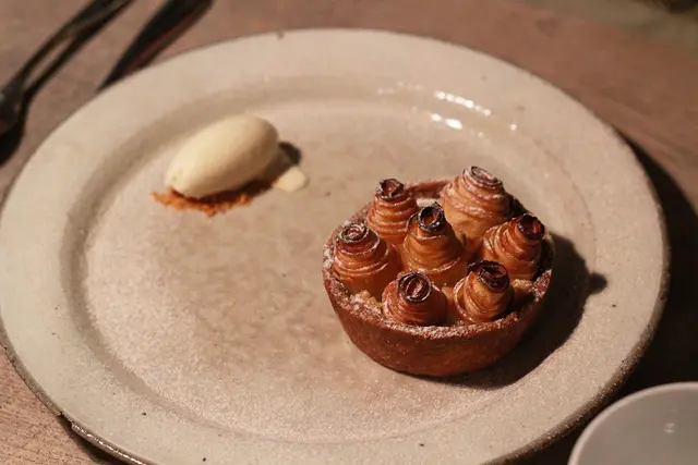 第一次見到這種造型的蘋果塔,蘋果削成薄片,像紙捲一樣捲起來、一捲一捲放在圓形的塔皮中