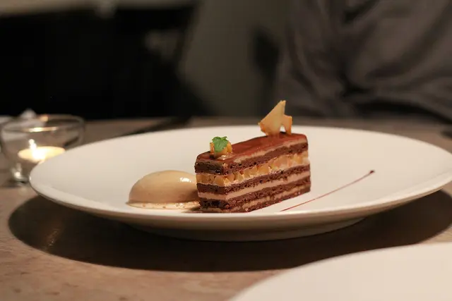 巧克力蛋糕加入柿子丁、榛果脆片,佐濃縮咖啡冰淇淋,風味及口感都有層次