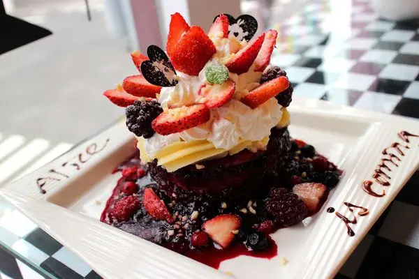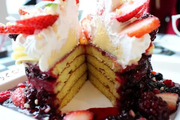 在層層堆疊而成的美式鬆餅塔上,淋上了鮮豔動人的莓果醬,