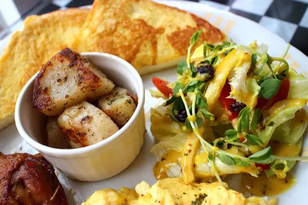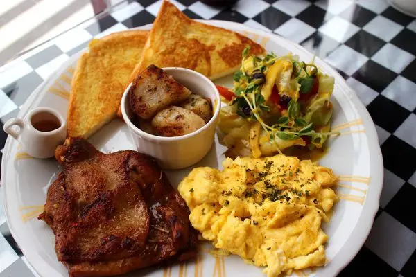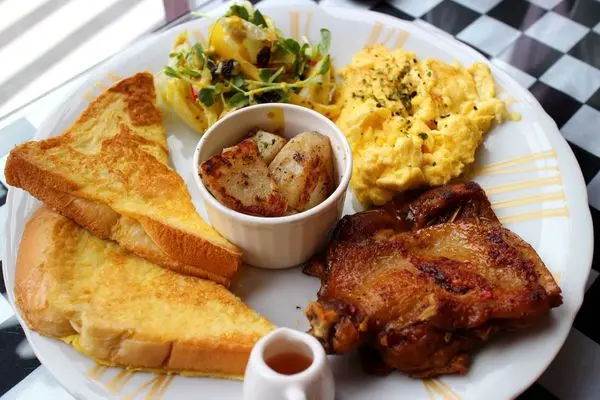 選擇夠份量的迷迭香雞腿早午餐,有沙拉、炒蛋、馬鈴薯、法式吐司,