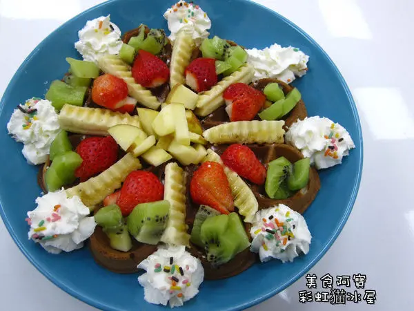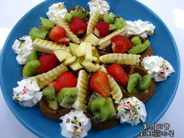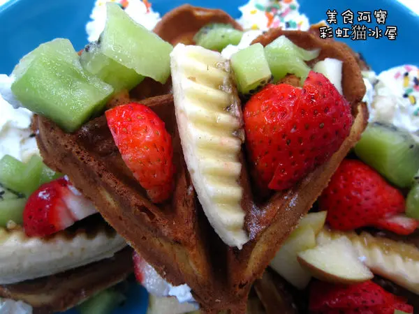 鬆餅上擺滿了各式新鮮水果,奇異果、蘋果、香蕉跟草莓四種水果,