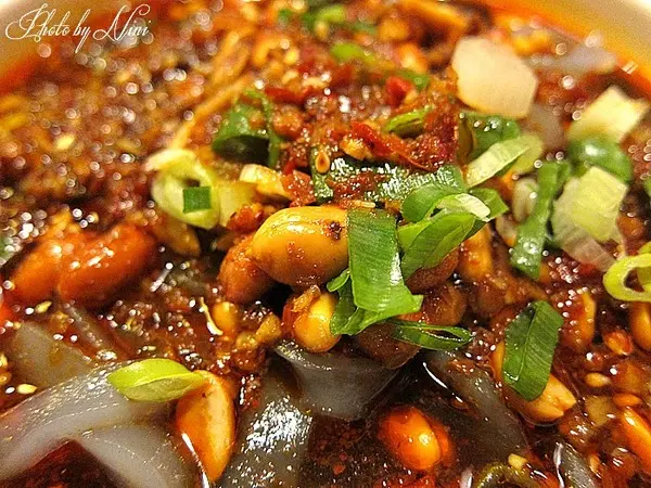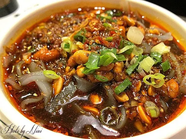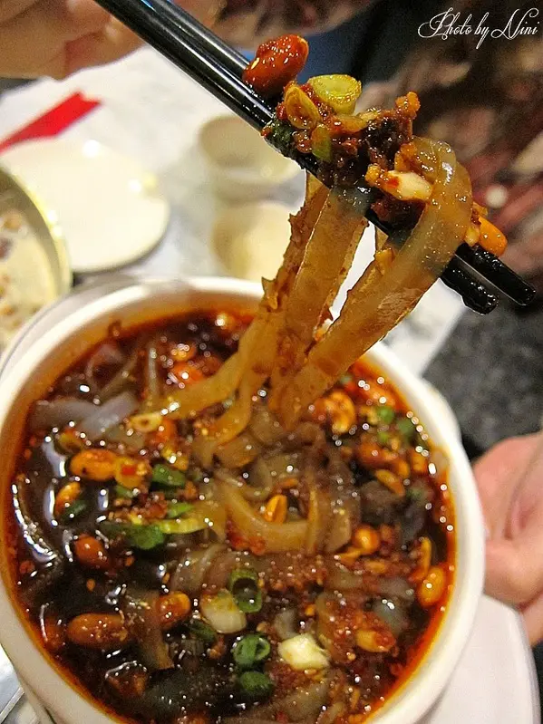 超級Q彈的涼皮吸滿麻辣醬汁,配青蔥和花生粒一起入口