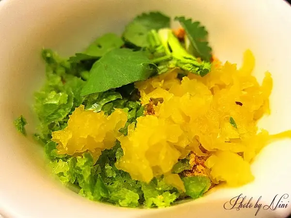 利用香菜末、青黃椒末、花生粉所調出的沾醬,可加入些許麻辣湯汁沾裹著吃