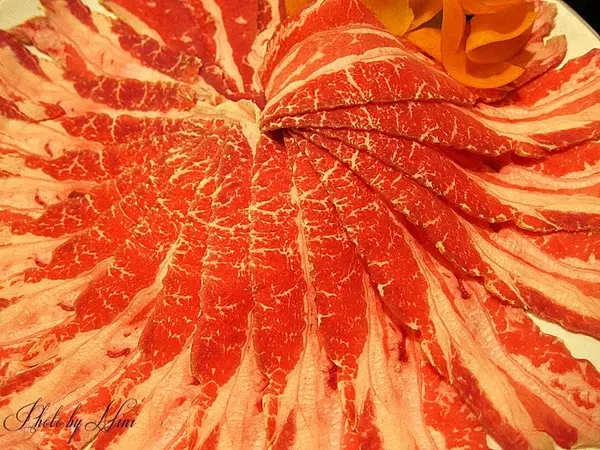 雪花牛的油脂分布的很均勻,每一片肉都切的非常薄