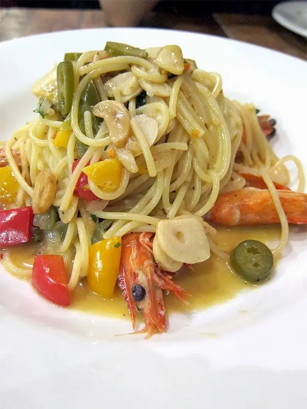 這道是用蒜片加入辣橄欖、紅黃椒和鮮蝦去拌炒,麵條很Q彈!不錯吃