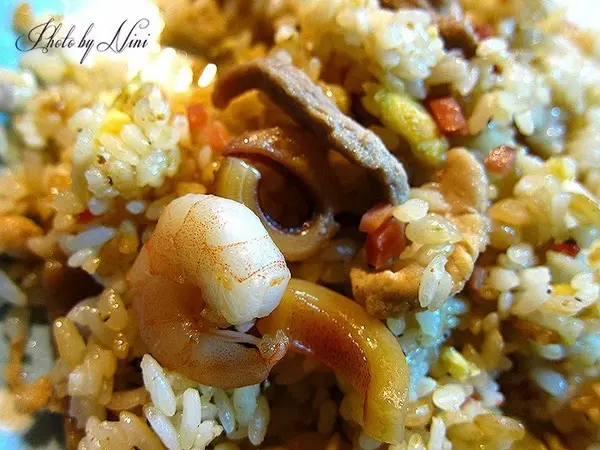 什錦炒飯有魷魚、肉絲、火腿丁、蛋、蝦仁在裡面