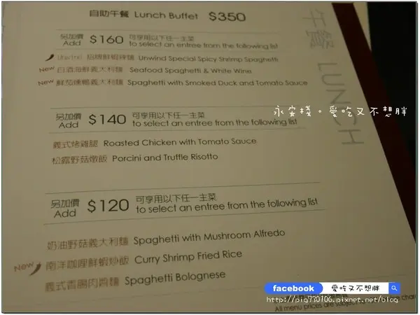 如果你覺得吃buffet不過癮,想要來點主餐,可以加價購買,有義大利麵、燉飯之類的,最貴也才350+160=510元再加10%的服務費